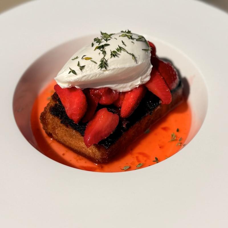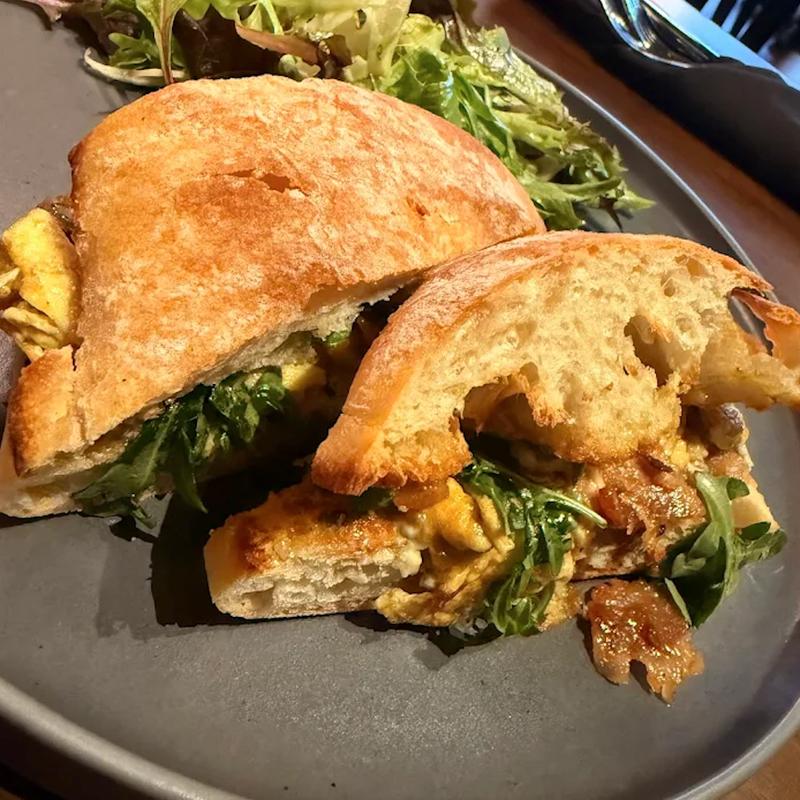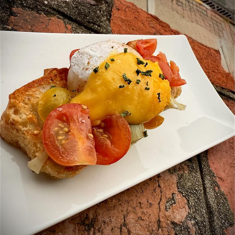 Toasted focaccia, poached eggs, zabaglione, pecorino, artichoke tomato salad