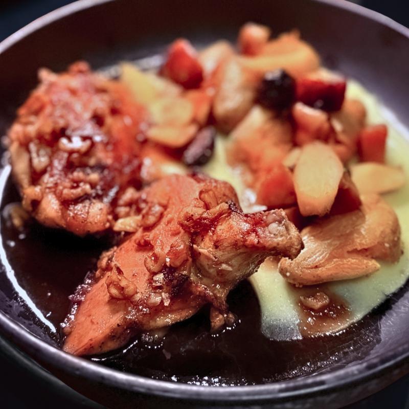 Apple, fig, parsnip, crispy fingerlings, fig honey glaze, walnut, vin cotto