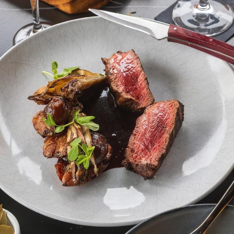 Crushed potatoes, endive, balsamic onions, red wine reduction